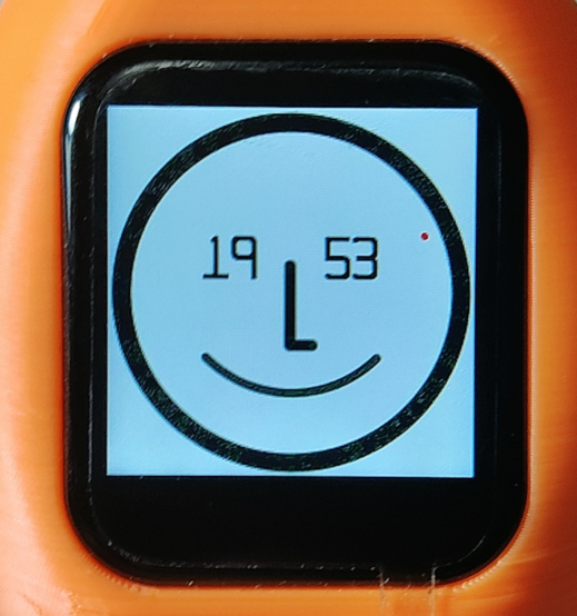 圆盘时钟界面,可通过单击mode键切换时钟表盘;双击mode键切换至表情时钟,单击播放表情(表情很简单,图一乐吧)。