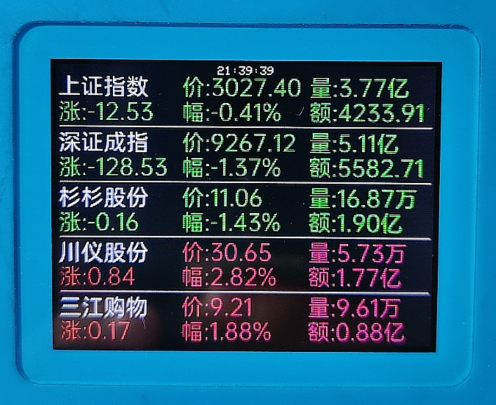 股票代码可在控制台进行设定,最多支持5支股票;数据刷新时间可设置3-30秒。