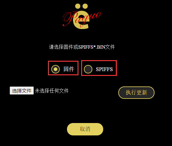 根据文件名选择相应更新类别即可,如无特别说明,firmware跟spiffs文件更新可不分前后(升级包中不一定每次都包含firmware跟spiffs两个文件,有谁就更新谁即可)。
