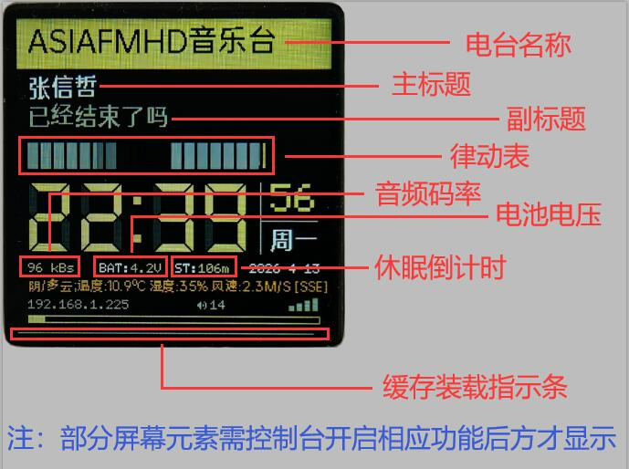 *点击左右键选台,长按左右键或旋转编码器调整音量,双击左右键可快速调整屏幕亮度,点击中键停止/播放,双击中键打开/关闭系统参数设置,长按中键进入语音识别模式(需事先配置ASR接口),最长可识别5秒。